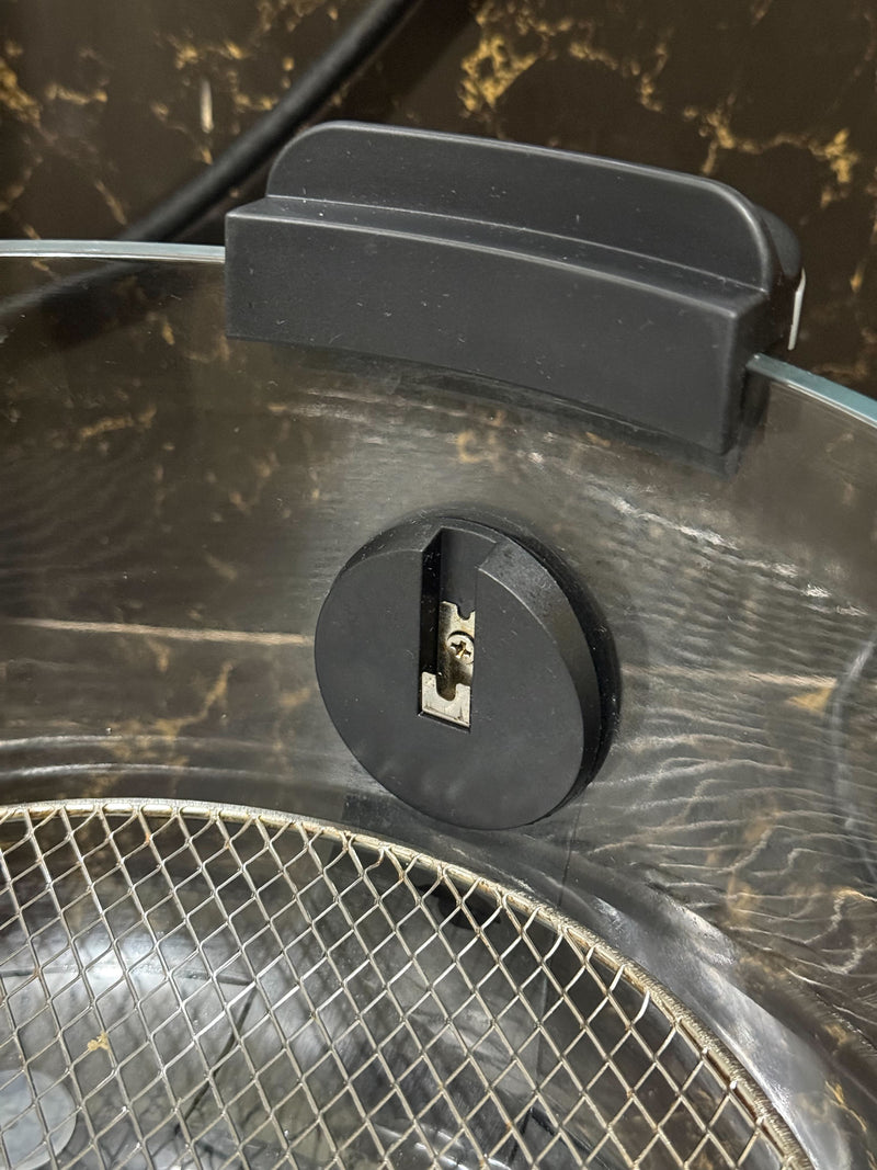 Inside the glass bowl is the shaft socket, the internal connection point that allows the Rotisserie Spit and Tumbling Basket to attach securely to the motor, which sits safely outside the cooking chamber. While this component appears black and plastic-like, it is made from food-safe PPS (Polyphenylene Sulfide), a high- performance material specifically chosen for its heat resistance, stability, and non-toxicity. PPS is commonly used in food and high-temperature applications because it does not leach, warp, or release harmful substances during cooking.