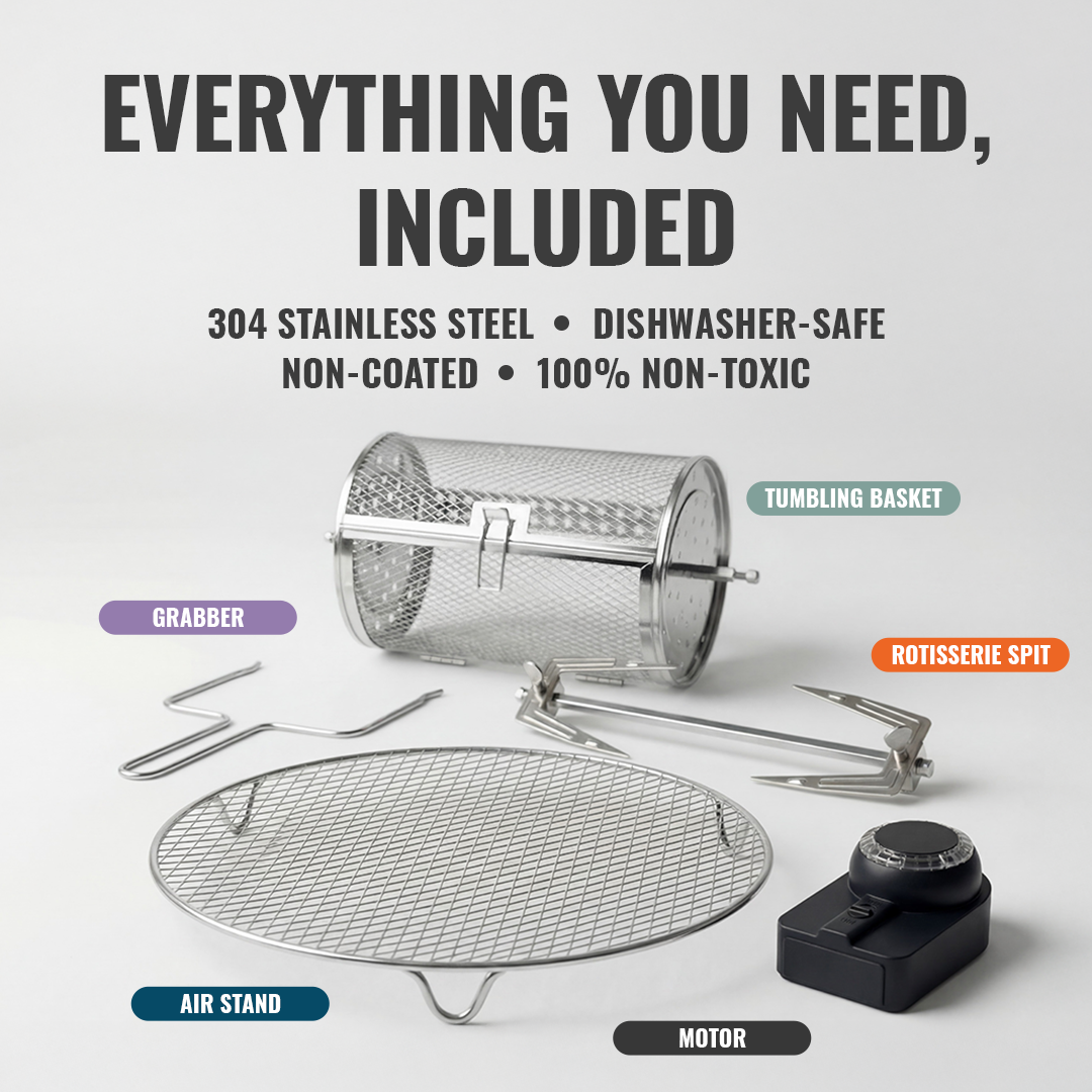 Air Stand, Tumbler Basket, Rotisserie, and Grabber.
