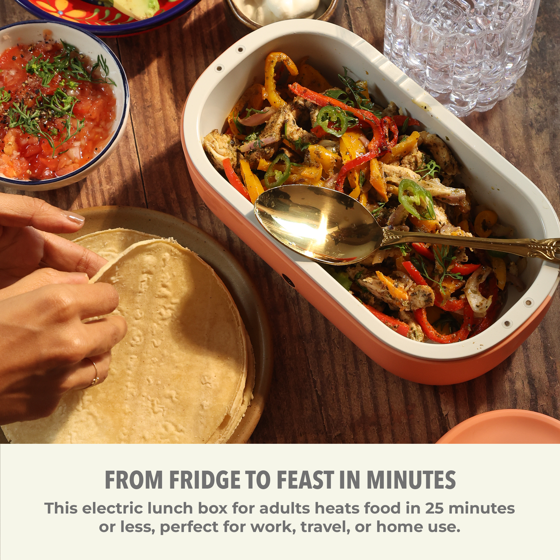- Plug-in lunchbox heats refrigerated food in 25 minutes or less.